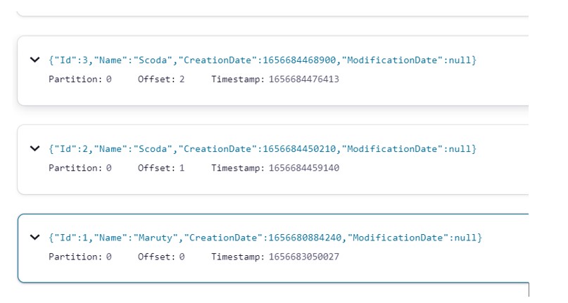 The above screenshot is taken from the control-center UI. Here we can find the message payload. When you add a new row to Cars table, it will push a new message to “Cars” topic. However, if you update existing row it will not publish any message.