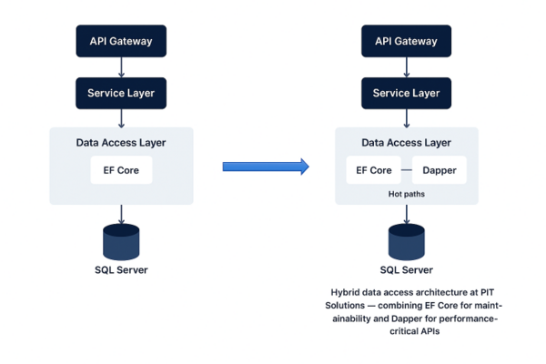 PIT Solutions optimized high-throughput APIs by blending EF Core’s efficiency with Dapper’s speed—achieving up to 60% faster execution and reduced memory usage through a balanced hybrid architecture.