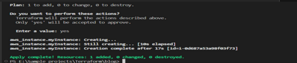 On executing this command, it asks for reconfirmation. Once you enter yes, it implements the desired changes. You can see the instance running in your AWS Management Console after the process of creation is completed.